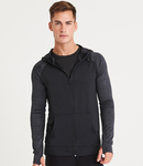Body 89% polyester/11% elastane. Hood and sleeves 92% polyester/8% elastane. DynamicCoolâ„¢ responsive blended fabric. Contrast melange effect grown on adjustable hood and raglan sleeves. Taped neck. Full length zip. Front pouch pockets. Thumbholes on cuffs. Tear out label.